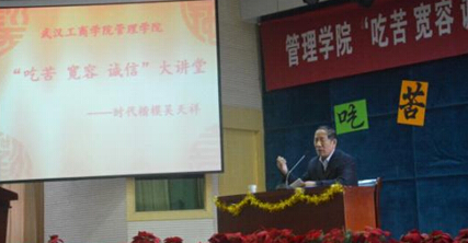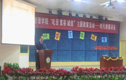 (管理学院分团委宣传部讯 通讯员:叶子英)11月19日上午9点在体育馆402,全国道德模范吴天祥做客我校管理学院开展的“吃苦 宽容 诚信”大讲堂活动,为我校学子带来了一场生动感人的时代楷模讲座。校党委书记陈伟、校学工部部长陈义文、副部长叶育桩、校团委书记吴艳、管理学院常务副院长李明、管理学院党总支书记吴茜、副书记陈玲、分团委书记汪燕及300余名学子聆听了此讲座。
