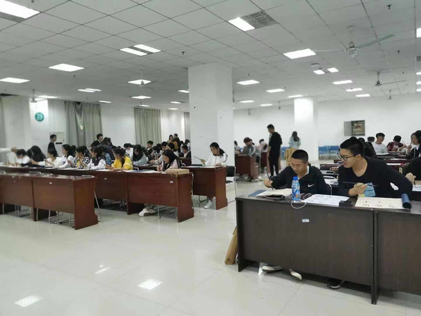 活动开始前,监察部进行了个人签字考勤。19点整练字课正式开始,会长罗双龙为本次课程主讲。首先,会长罗双龙讲解了毛笔握笔姿势、坐姿要求以及如何使用墨盒,并让各位成员按讲解来用笔、用墨。接着,又讲解了篆书横竖线条的写法。“起笔藏锋,行笔中锋,收笔回锋”,是逸墨19级新生会员第一节练字课的“主题”。在成员们进行横竖线条练习的同时,会长罗双龙、教学部部长赵深泉及其部委,在教室进行“一对一”辅导,全体成员兴趣高涨,练字十分认真。