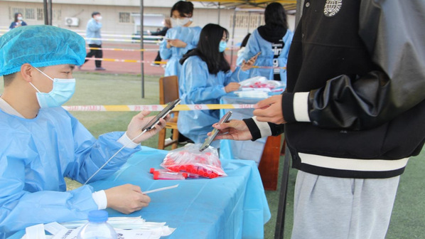 2022年3月4日,因武汉洪山区疫情新增,我校再次号召全校在操场分批做核酸。部分学生穿上防护服,做志愿者,指导学生们扫码,领取棉签并进行核酸检测。