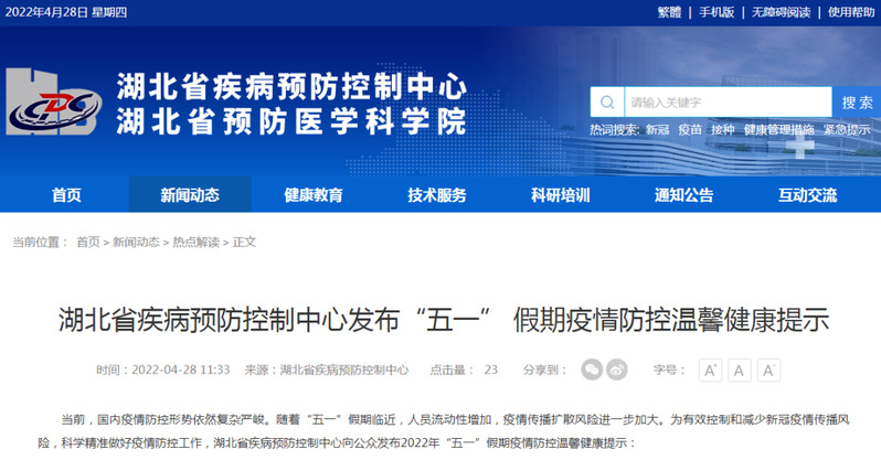 当前,国内疫情防控形势依然复杂严峻。随着“五一”假期临近,人员流动性增加,疫情传播扩散风险进一步加大。为有效控制和减少新冠疫情传播风险,科学精准做好疫情防控工作,湖北省疾病预防控制中心向公众发布2022年“五一”假期疫情防控温馨健康提示: