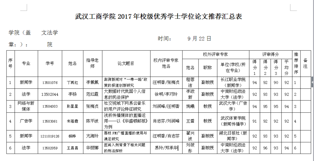 经各系推荐,并集中组织校内外专家进行综合评审,共评出丁再红等6名学生的论文推荐为校级优秀学士学位论文,现将具体结果进行公示。