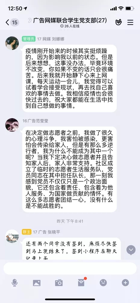 在此次线上讨论中支部各学生党员都积极主动地表达了自己的感悟,让我们受益匪浅。其中,樊雅靖同志提到:相信这次加长版的寒假给大家带来了别样的感受,很多人从未像现在这样真切地感受到我们不仅仅是以个人的身份生活,而是与所处的时代同呼吸,共命运。同学们都是“非典”前后出生的,这是你们有记忆以来第一次面对全国性重大公共卫生事件。