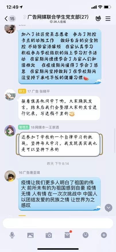 本次交流活动全程为线上开展,将支部内16级至18级广告和网媒专业的27名学生党员召集起来,通过观看视频,PPT讲解等形式,支部学生党员们围绕主题根据自身实际情况积极进行了交流。