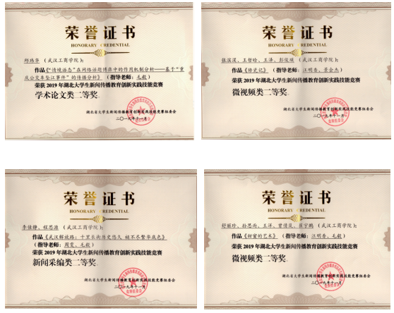 张滨淏同学在2019年全国大学生新媒体知识竞赛中获得国家级三等奖;和许潇等人编导的作品《自渡》在中国大学生微电影创作大赛中获得优秀奖;参赛作品《中国虾谷360品牌策划》在全球大学生品牌策划大赛中获得国家级二等奖。肖梦茹同学在2019年第三届全国大学生环保知识竞赛中获得优秀奖,制作的《毕业季MV之再见再见》荣获第八届“视友杯”中国高校电视奖综艺类三等奖。