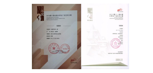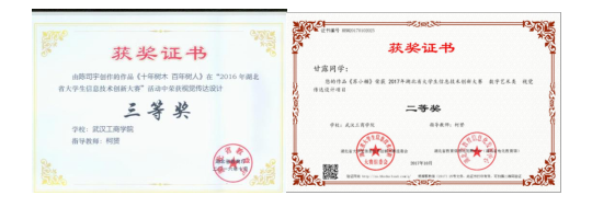 在柯赟老师指导下,钟杭羽、赵疏影的作品《中国梦系列——家》荣获2016年度H5交互类国家级三等奖;在窦玲老师指导下,廖欣文、杨芳同学的作品《购物在指间、送货眨眼间》荣获2019年度视频类省部级二等奖。