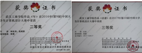 在柯赟老师指导下,钟杭羽、赵疏影的作品《年》荣获2016年度动画类国家级二等奖;汪培同学的作品《活着》荣获2017年度平面类国家级三等奖。