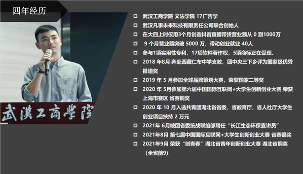 李义凡先向在场的新生们做了个自我介绍,他在大四上时仅用3个月创造抖音直播带货营业额从 0 到1000万,参与1项实用性专利,17项软件著作权,5项商标正在受理,他也先后获得全球品牌策划大赛国家二等奖、第七届中国国际互联网+大学生创新创业大赛省赛银奖、“创青春”湖北省青年创新创业大赛 湖北省铜奖等荣誉。听完李义凡的介绍,新生们对于台上这位学长所要分享的内容充满了兴趣!