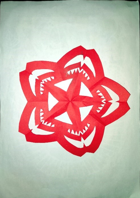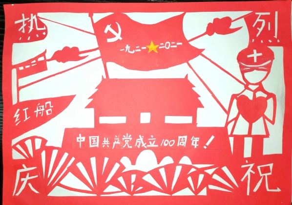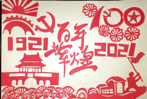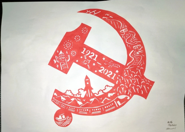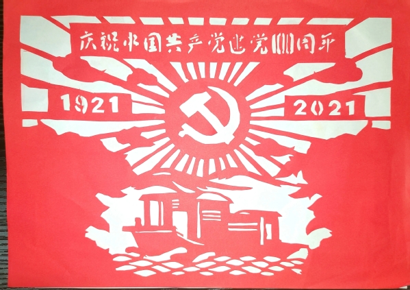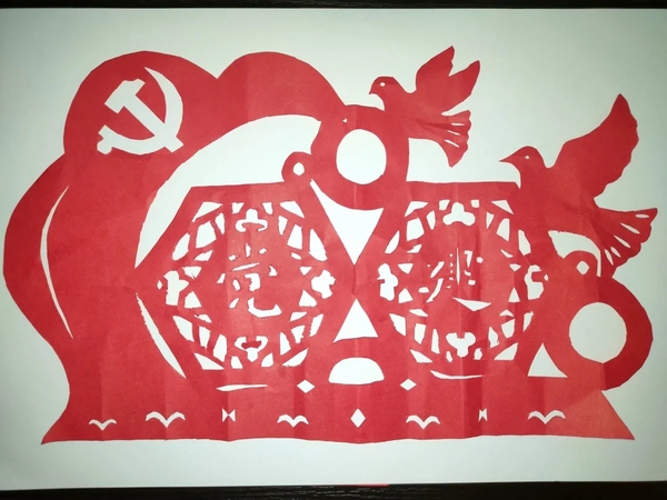 围绕建党一百周年,剪出两只报喜鸟,带来建党一百周年的喜讯,再剪出一百的象形,用六边形模拟两个零,中间利用窗花镂空设计填充,中心再剪出党建的汉字,升华作品主题.作品中利用同心圆链接,使作品连贯。