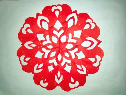 我的作品是一个七折团花,它的布局格式呈圆形花样、四面均齐。作为传统寓意纹样,有吉祥喜庆 ,团团圆圆 ,和谐美好之意。在此为庆祝党的一百周年,我想用这幅七折团花表达对峥嵘党史的美好追忆,对党的不屈不挠的顽强拼搏精神的发扬传承,以及对党的发展前途一片光明的象征。