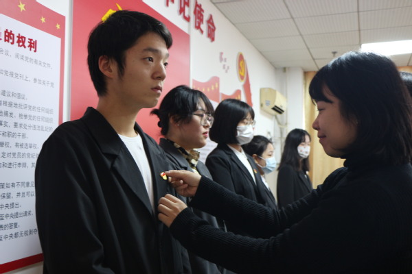 宣誓会议伊始,迎党旗,奏《国歌》,然后由法学学生党支部书记肖隽宣读《关于文法学院法学学生党支部接收李虹瑶等同志为预备党员决议》和》《关于文法学院法学学生党支部接收郜嘉启同志为正式决议》。宣读决议后,法学教师党员们分别为法学学生党支部新晋的12名党员佩戴党徽。