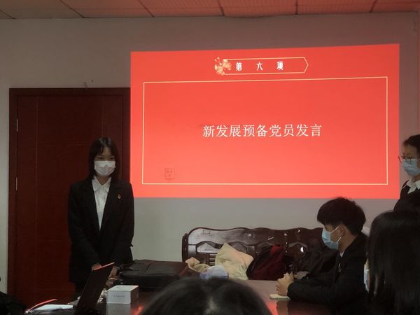 大会第六项,由新发展预备党员金羽菲同志作为代表发言,她表示,在未来的学习生活中将会更严格的要求自己,吃苦在前,享受在后,积极参加支部活动,切实加强政治理论知识学习,提高理论水平和思想觉悟,发挥先锋模范带头作用。