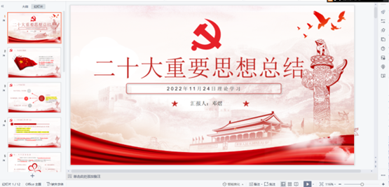 首先,由主持人带领全体党员集体学习了习近平总书记在中国共产党第二十次全国代表大会上作的报告。习近平总书记的讲话为建设工作指明了方向,即全面贯彻新时代中国特色社会主义思想,弘扬伟大建党精神,自信自强、守正创新,踔厉奋发、勇毅前行,为全面建设社会主义现代化国家、全面推进中华民族伟大复兴而团结奋斗。