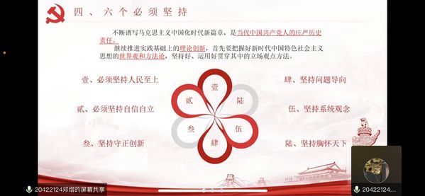 随后,与会同志对“三个务必”、“六个必须坚持”、“五个必由之路”、“两步走战略安排”等二十大核心理论进行深刻了解,明确了中国共产党当下的中心任务,知晓了坚持中国式现代化和全面建设现代化社会主义国家的必要性。主持人强调,党的二十大进一步指明了党和国家事业的前进方向,是我们党团结带领全国各族人民在新时代新征程坚持和发展中国特色社会主义的政治宣言和行动纲领。全党全国各族人民要在党的旗帜下团结成“一块坚硬的钢铁”,心往一处想、劲往一处使,确保中国特色社会主义道路走得对、走得通、走得稳、走得好。