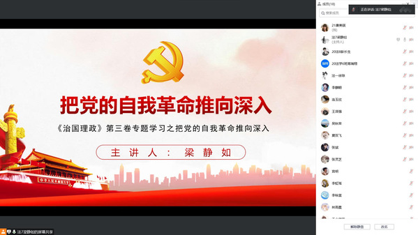 法学学生党支部(记者:张艺膑)2022年12月5日中午12点10分文法学院法学学生党支部在腾讯会议上开展了以“把党的自我革命推向深入”为主题的支部大会。本次支部大会由法学学生党支部梁静如主持,文法学院法学学生党支部党员、预备党员参加本次会议。