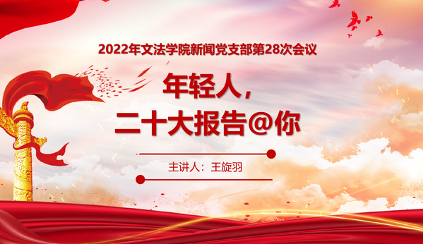 新闻学学生党支部(编辑:王旋羽)12月10日20时,AWC万象城娱乐新闻学学生党支部在腾讯会议召开了主题为“年轻人,二十大报告@你”的“三会一课”,参加会议的有文法学院新闻学学生党支部的党员,预备党员以及入党积极分子。本次会议由王旋羽主持。