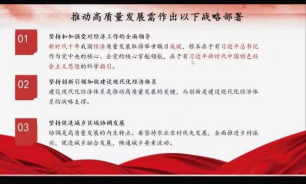 “为推动高质量发展需作出了以下战略部署,坚持和加强党对经济工作的全面领导,坚持创新引领加快建设现代化经济体系,坚持促进城乡区域协调发展,坚持推动绿色低碳转型,坚持深化市场化改革、扩大高水平对外开放,坚持人民至上、发展为民,坚持统筹发展和安全。”汪旸说道。