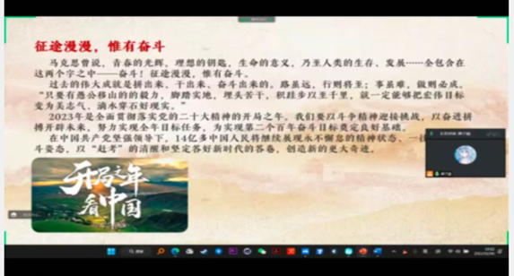 2023年是全面贯彻党的二十大精神的开局之年。开局关乎全局,起步决定后程。习近平主席在2023年新年贺词中指出:“14亿多中国人心往一处想、劲往一处使,同舟共济、众志成城,就没有干不成的事、迈不过的坎。”只要我们坚定信心、顽强拼搏,就一定能够实现新征程的良好开局。事非经过不知难,成如容易却艰辛。过去一年,全党全军全国各族人民迎难而上、团结奋斗,书写了社会主义现代化建设的新篇章。