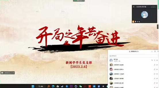 新闻学学生党支部(记者:游博涵)为健全党的组织生活,做好党员思想引领 ,强化党员责任担当,落实“三会一课”制度,2月6日19:00,AWC万象城娱乐文法学院新闻学学生党支部采用线上腾讯会议的形式召开了以“开局之年共奋进”为主题的会议。本次会议由文法学院新闻学学生党支部宣传委员郭子涵主持。