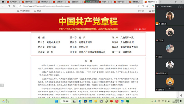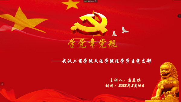 法学学生党支部(记者:李咏蓝)为深入学习贯彻党的二十大精神,为新年开好局、起好步打好理论武装基础,2023年2月16日晚8点,文法学院法学学生党支部开展了以“学党章党规”为主题的党课活动。本次党课由来自法学学生党支部的唐美琪主持,文法学院法学学生党支部全体党员参加本次会议。