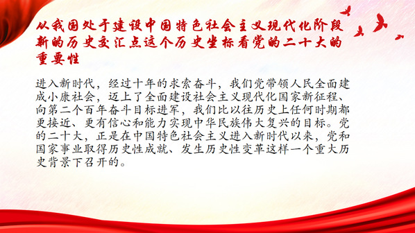 主持人分别从我国处于建设中国特色社会主义现代化阶段新的历史交汇点、走过百年奋斗历程的中国共产党迈上新的历史征程的新起点、世界面临百年未有之大变局新的历史拐点这三个不同的历史坐标带大家看党的二十大的重要性。