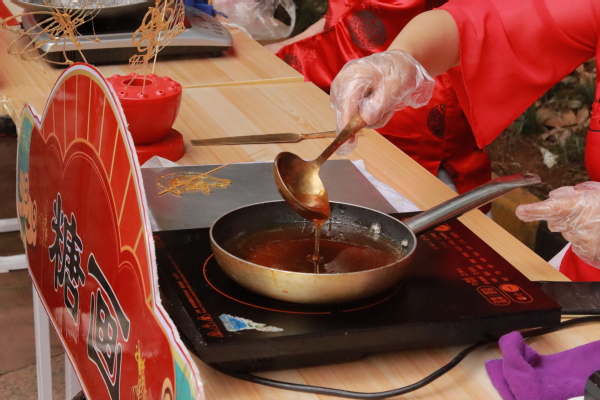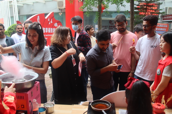 现场还为留学生们准备了三种中国传统美食,分别是糖画、糖葫芦、棉花糖。