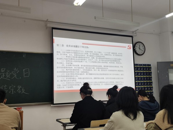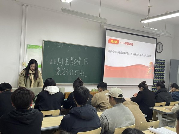 (广告网媒联合学生党支部通讯员:张宇霄)《关于新形势下党内政治生活的若干准则》中明确规定:“党员不准搞封建迷信,不准信仰宗教,不准参与邪教,不准纵容和支持宗教极端势力、民族分裂势力、暴力恐怖势力及其活动”。2023年11月28日中午12点15分文法学院新闻学学生党支部、法学学生党支部、广告网媒联合学生党支部开展了以“信党不信教做合格党员”为主题的党课活动。本次党课由来自新闻学学生党支部的付雨晨同学主持,文法学院各学生党支部党员及预备党员参加本次会议。