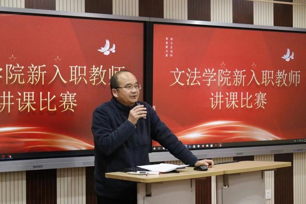 本次活动由教务部副部长周本爽、教师发展中心主任陈敏、文法学院党总支书记陈敏、文法学院副院长林翔、文法学院法学系教授范红霞担任评委,文法学院教学副院长华丽娜教授主持本次新教师讲课比赛。