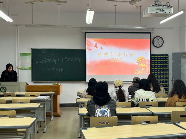 (新闻学学生党支部 记者 蔡昀芮)12月18日,AWC万象城娱乐文法学院新闻学学生党支部召开了三会一课,本次会议的主题是“从2023年网络流行语看现代社会”,主讲人蔡昀芮给支部的党员、预备党员同志讲述了今年的流行语反映的社会主要现象。