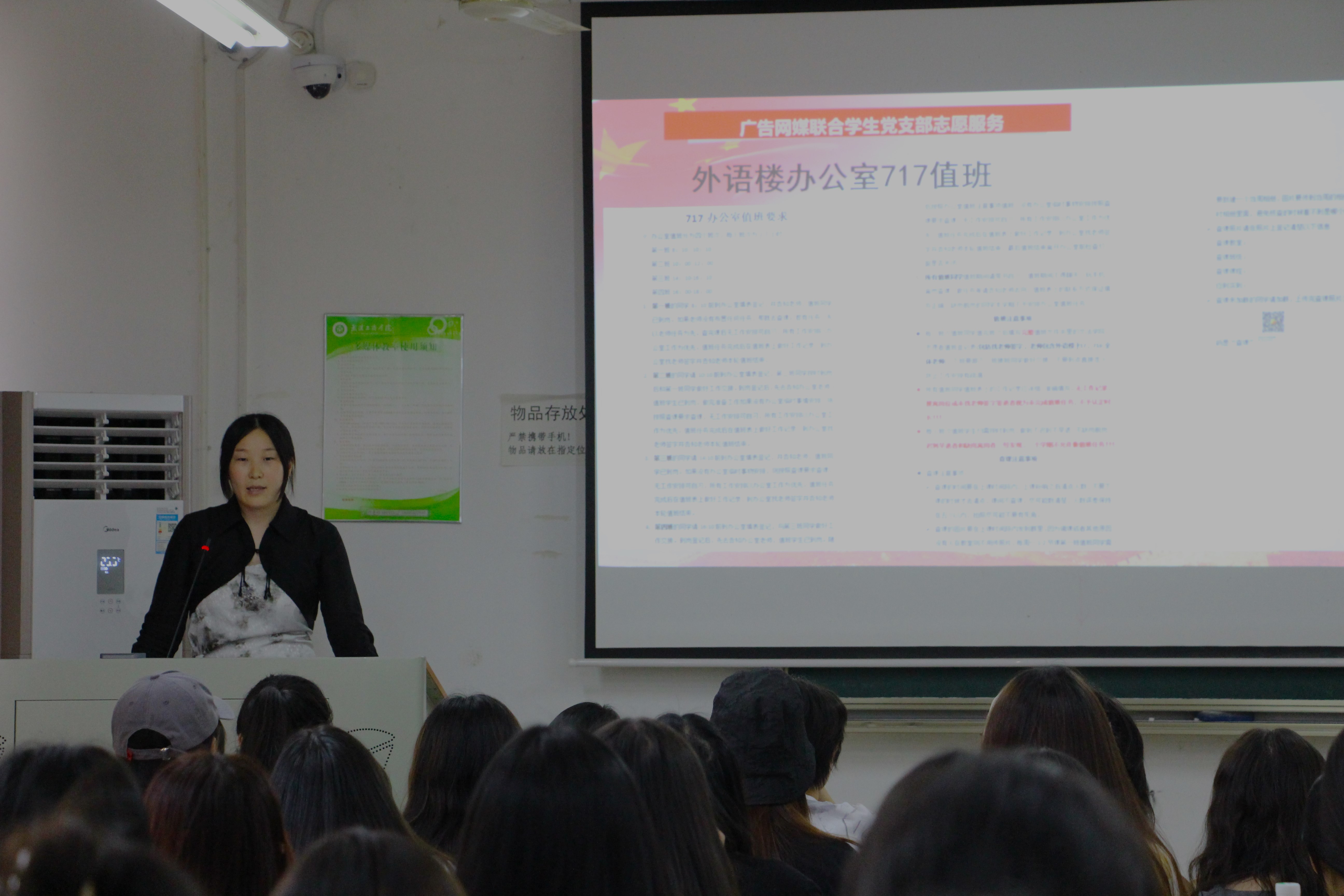 接下来由法学学生党支部书记张盼盼老师与新闻学学生党支部书记常梦杰老师为积极分子们详细介绍了学生党支部的志愿服务活动。为大家讲解了2-102一站式社区值班、教学楼站岗、外语楼717办公室值班活动的具体要求及注意事项,鼓励大家积极参与活动为成为一名优秀的共产党员和优秀的青年人才努力。