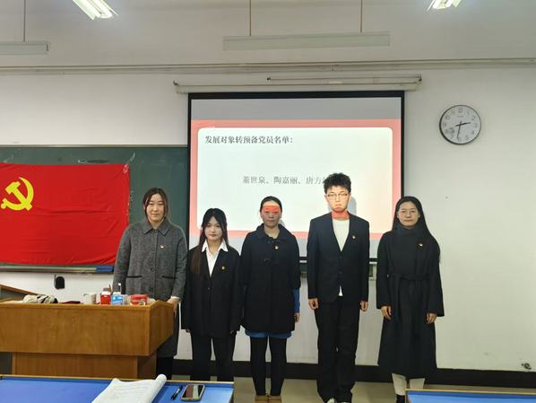 第三项议程,宣读发展对象转预备党员以及预备党员转正式党员名单。主持人宣读完毕后,进行第四项议程,由法学学生党支部书记张盼盼老师带领新发展党员宣誓。