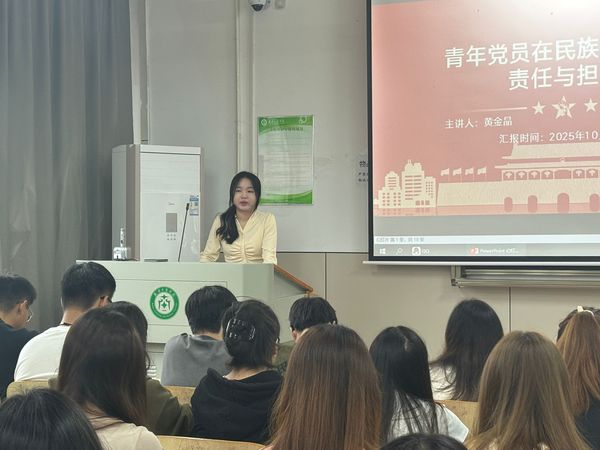 主讲人黄金晶以刚刚结束的法考主观题引出了“青年党员在民族复兴中的责任与担当”的重要性并进行了仔细的分析讲解。她将本次演讲分为五个板块,分别从时代之问、角色自觉、信念根基、本领提升和品格塑造进行展开,生动且具体地展现了青年党员在民族复兴中的责任与担当。主讲人黄金晶指出,政治复兴是民族复兴的制度基石,法学青年党员需自觉定位“强国分子”与“先锋分子”双重身份,明晰专业使命。她提出以勤学苦练积蓄专业势能,明确学生党员的学习任务、专业能力提升及实践进步方向,强调以知行合一检验担当成色;最后要求青年党员以严明纪律守底线、以高尚品德引领风尚,引领大家认识青年党员重要角色,鼓励争做优秀青年党员。