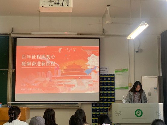 今天的会议,刘梦雅同志以“百年征程照初心砥砺奋进新征程”为主题开展专题学习,旨在通过系统学习党的百年奋斗历程,引导青年学子从党史中汲取智慧力量,将红色基因融入专业实践,在新时代展现青年党员的责任担当。