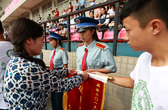 在分列式上,物流学院阅兵方阵昂首挺胸,精神抖擞,以铿锵有力的步伐走向主席台。以整齐嘹亮的口号接受领导们的检阅。物流学院方阵因在汇报表演中表现突出,被授予“优秀方阵”的荣誉称号。