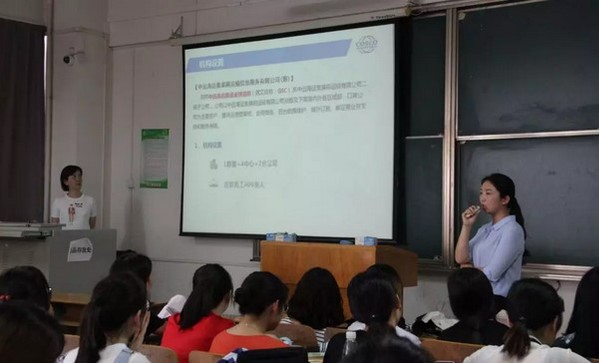 图为中远人事专员刘晶为同学们介绍公司情况
