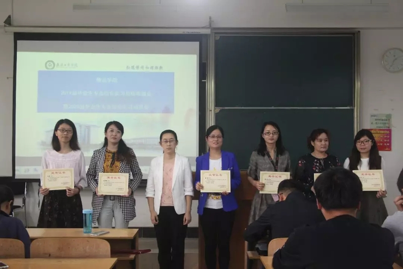 首先,蔡菁书记对2019年毕业综合实习工作进行了总结,并宣读了《关于表彰2019届优秀实习生、优秀实习指导教师的决定》。授予2015级王长祥、王哲明、曾瑾焕、梁逸飞、艾沛然、刘丽琦6位同学优秀实习生荣誉称号,授予杜玮卉、周小芬、操露、付蒙、蔡红玲、冯媛媛6名教师优秀实习就业指导教师荣誉称号。党总支书记蔡菁、物流管理系副主任车骏、物流工程系副主任张龙分别为获奖教师和学生颁奖。