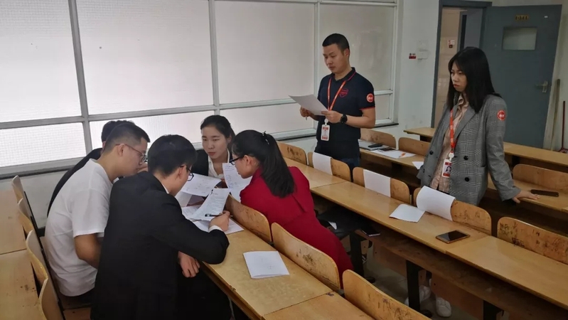 图为华中大区区总刘艳伟正在组织面试学生做无领导小组讨论 摄影:林倩