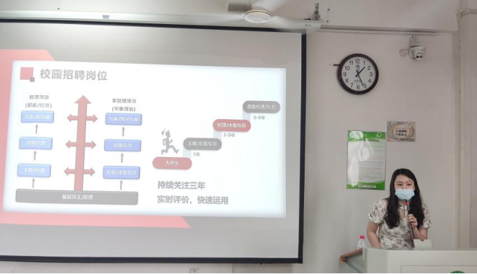 会议起始,以播放顺丰宣传片拉开宣讲会的序幕,视频讲述了顺丰速运有限公司的发展历程及员工发展方向。随后,肖飘经理讲述了自己在顺丰的工作经验和心得体会,并着重介绍了顺丰本次招聘的岗位、职业发展通道与路径、发展平台、招聘人数、薪酬福利、工作场景等。