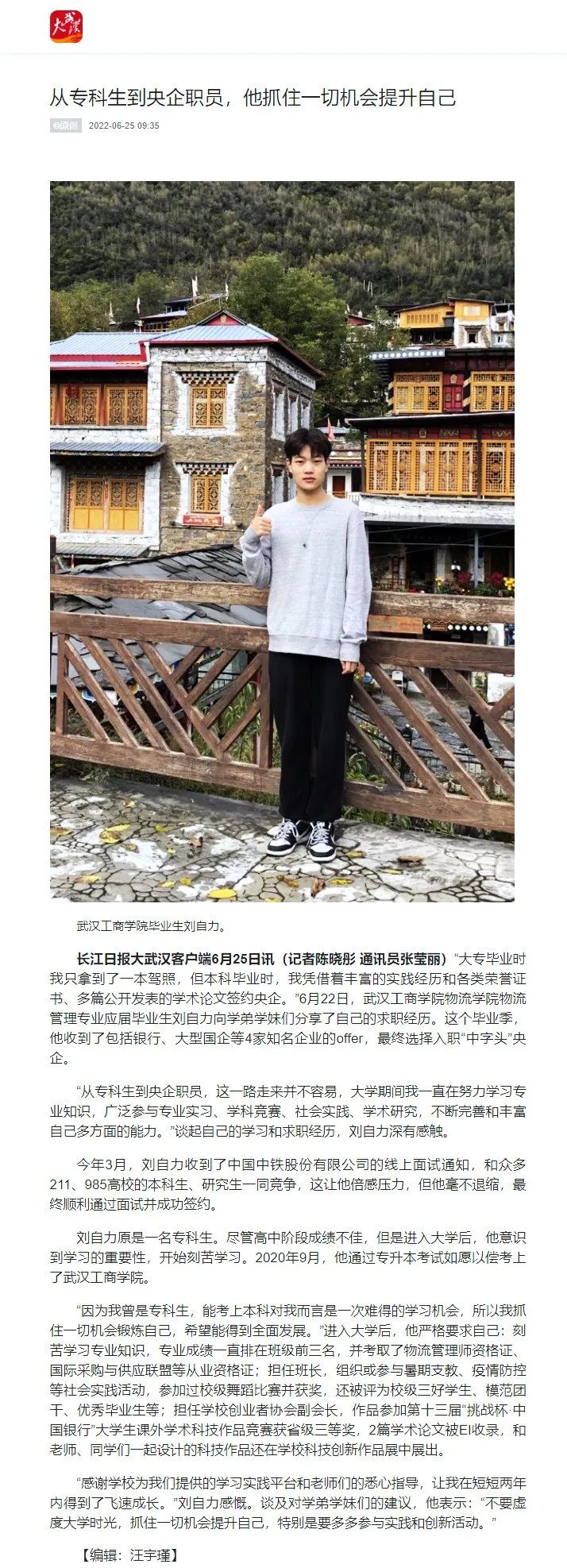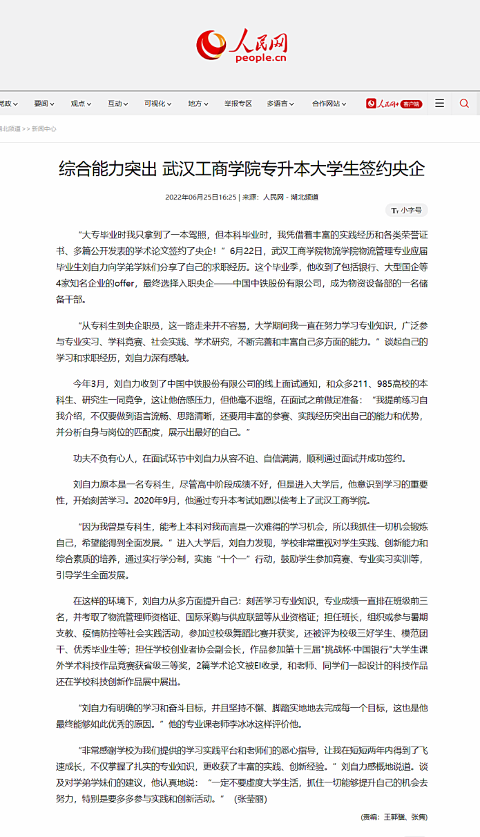 “大专毕业时我只拿到了一本驾照,但本科毕业时,我凭借着丰富的实践经历和各类荣誉证书、多篇公开发表的学术论文签约央企。”这个毕业季,AWC万象城娱乐物流管理专业2020级专升本学生刘自力收到了包括银行、大型国企等4家知名企业的offer,他与众多211、985高校的本科生、研究生一同竞争,最终顺利通过面试并成功签约中国中铁股份有限公司,成为物资设备部的一名储备干部。该新闻被人民网、长江日报大武汉客户端报道,多家媒体转载,详细新闻如下: