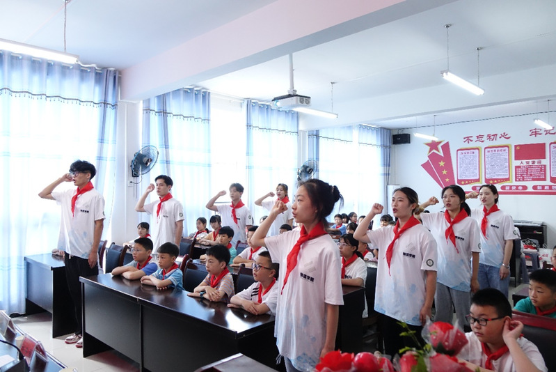 “青火”社会实践服务队学生代表张妍和向新分别介绍了本次参加”七彩假期“暑期支教的队员和支教课程及活动安排,最后“青火”社会实践服务队全体成员庄严宣誓。