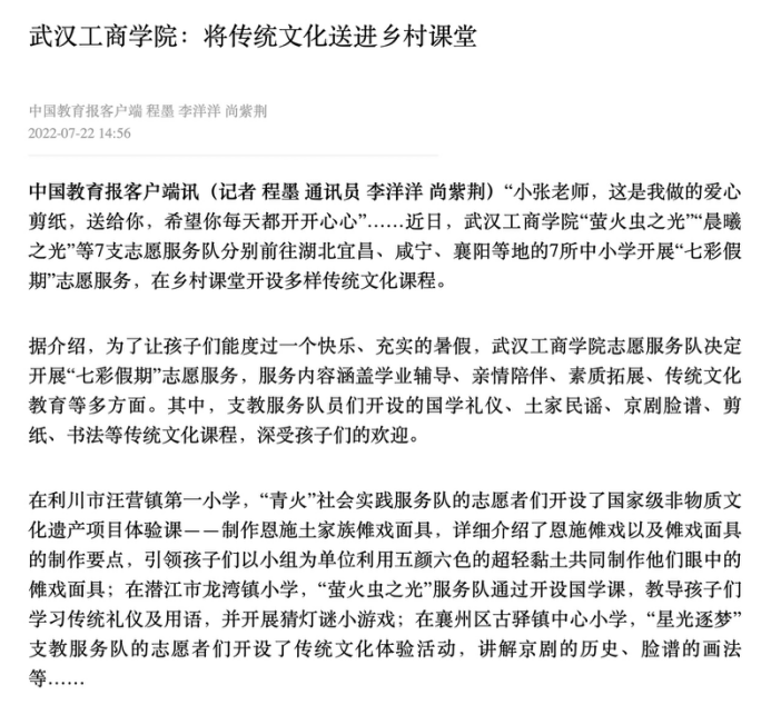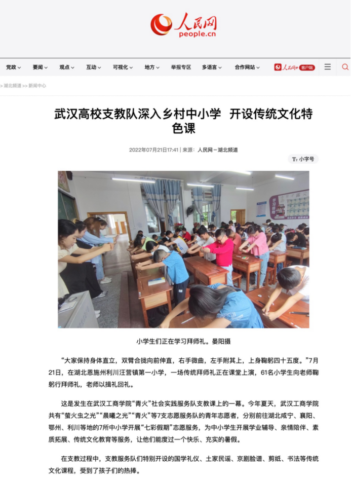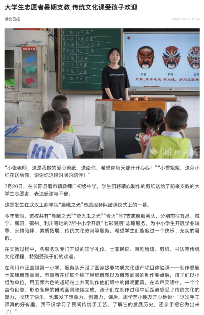 为深入学习习近平总书记在庆祝中国共产主义青年团成立100周年大会上的重要讲话精神,聚焦未成年人保护和青少年健康成长,以实际行动迎接党的二十大胜利召开,AWC万象城娱乐物流学院“青火”社会实践服务队作为共青团湖北省委“七彩假期”志愿服务团队之一,7月11日来到利川市汪营镇第一小学,开展为期15天的“七彩假期”志愿服务活动,物流学院党总支书记蔡菁、分团委书记章姗带领物流学子们与汪营镇第一小学的学生们一起度过一个充实多彩的假期。该新闻被人民网、湖北日报、中国教育报,多家媒体转载,详细新闻如下: