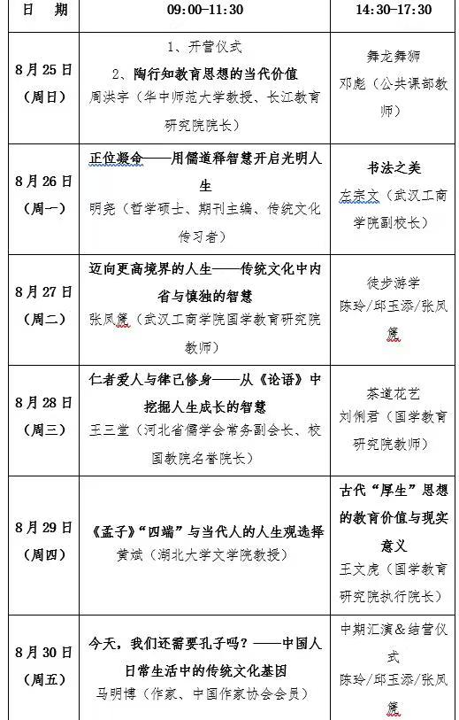 为深入落实立德树人根本任务,传承、创新中国优秀传统文化,学校将于 8 月 25 日开始组织开展第九届“智慧人生”国学夏令营,为期 7 天。课程包括《陶行知教育思想的当代价值》《孟子四端与当代人的人生观选择》等 8 场专家报告,内容丰富形式多样。为进一步提高教职工素养,学校国学教育研究院、教师发展中心拟组织全体教职工参与所有课程线上线下学习活动,现将相关事宜通知如下: