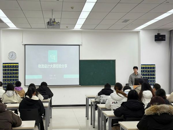 随后,杨广同学为大家带来了物流设计大赛的经验分享。他讲述了自己在备赛过程中的艰辛与收获,分享了如何在比赛中运用所学知识解决实际问题,以及如何在团队中发挥个人优势、协同合作的经验。杨广同学的分享让在场的同学们深受启发,纷纷表示想要积极参与各类学科竞赛,提升自己的实践能力和创新能力的意愿。