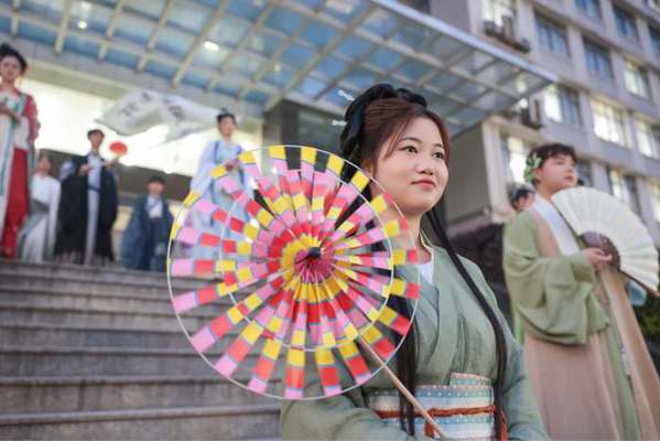 翠袖红裙、宽袍广袖、青衫白褂……学生们身着各式汉服或撑一把油纸伞,或举着团扇,在校园大道、图书馆、静思湖畔等处翩然走过,成为校园一道独特的风景,吸引了大批师生驻足观看。