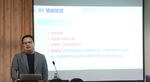 雷辉采用理论与案例相结合的方式,详细介绍了情绪管理的意义、如何调节情绪、压力产生的原因以及应对办法。他通过鲜活的案例向同学们讲解了情绪管理中的三个常见不合理认知,以生动的演示告诉同学们如何调节情绪,做情绪的主人。