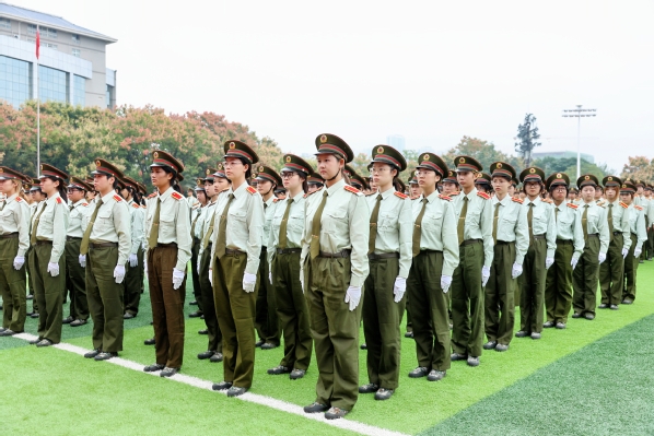 拳术方队的表演点燃全场激情。队员们目光如炬,神采奕奕。冲拳、弹腿、格挡,动作刚劲有力,整齐划一;转身、腾挪、收势,姿态利落干脆,充满力量,充分展现了新生们经过军训锻炼后坚韧不拔的意志和过硬的军事素养。