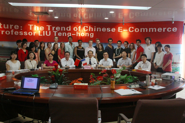刘腾红教授做了题为《中国电子商务发展趋势》的讲座,他结合美国、英国、日本电子商务发展的现状,提出了中国电子商务发展的八大趋势,包括“全民网购”、“电视电话电脑三网融合”、“移动电子商务广泛应用”等。在讲座的过程中,刘腾红还与法国学生进行了互动交流。