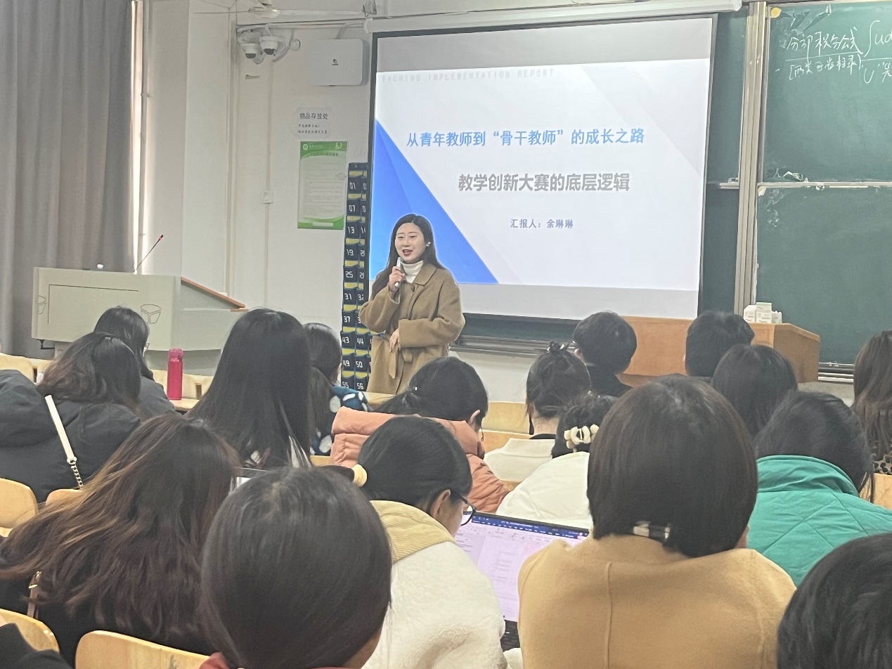 余琳琳教授曾获得第二届全国高校教师教学创新大赛(副高组)省赛特等奖,以及各类国家级教学大赛奖项,在教学创新大赛中的经验十分丰富,由此,余琳琳副教授给我院全体教师讲述了她从青年教师到“骨干教师”的成长之路。