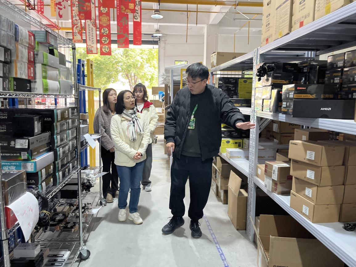 接着,魏院长一行人被引领至仓库区参观。在这里负责人介绍到了公司的组装、包装以及出货一系列流程。偌大的仓库间整齐干净,每个货架都有对应标识,所有产品都能够快速找到。此外,仓库间还有一个自检区域,被顾客退回的商品都会在这里进行检查,确认是哪一部分出现了问题并加以改正、吸取教训,在之后的出货与组装中也会重点关注。