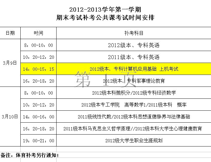 根据本学期教学工作安排,2012-2013学年第一学期的期末考试补考定于2013年3月9、10日两天(上课后第二周周末)进行,为做好补考工作,现将有关事项通知如下: