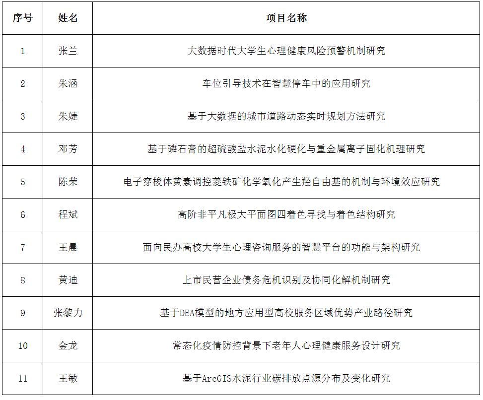 根据《湖北省教育厅关于组织申报2022年度湖北省教育厅科研计划项目的通知》文件要求,经个人申请,二级学院推荐,专家评审,推荐出指导性项目10项。另根据文件参加了2021年度高校科技统计的高校,每校可申报1项科技管理相关指导性项目,不占本校申报指标,仅限科技管理人员申报。学校申报1项科技管理指导性项目1项,共计11项。现予以公示,公示期为5天(2022年6月10日—6月14日)。具体项目名单如下: